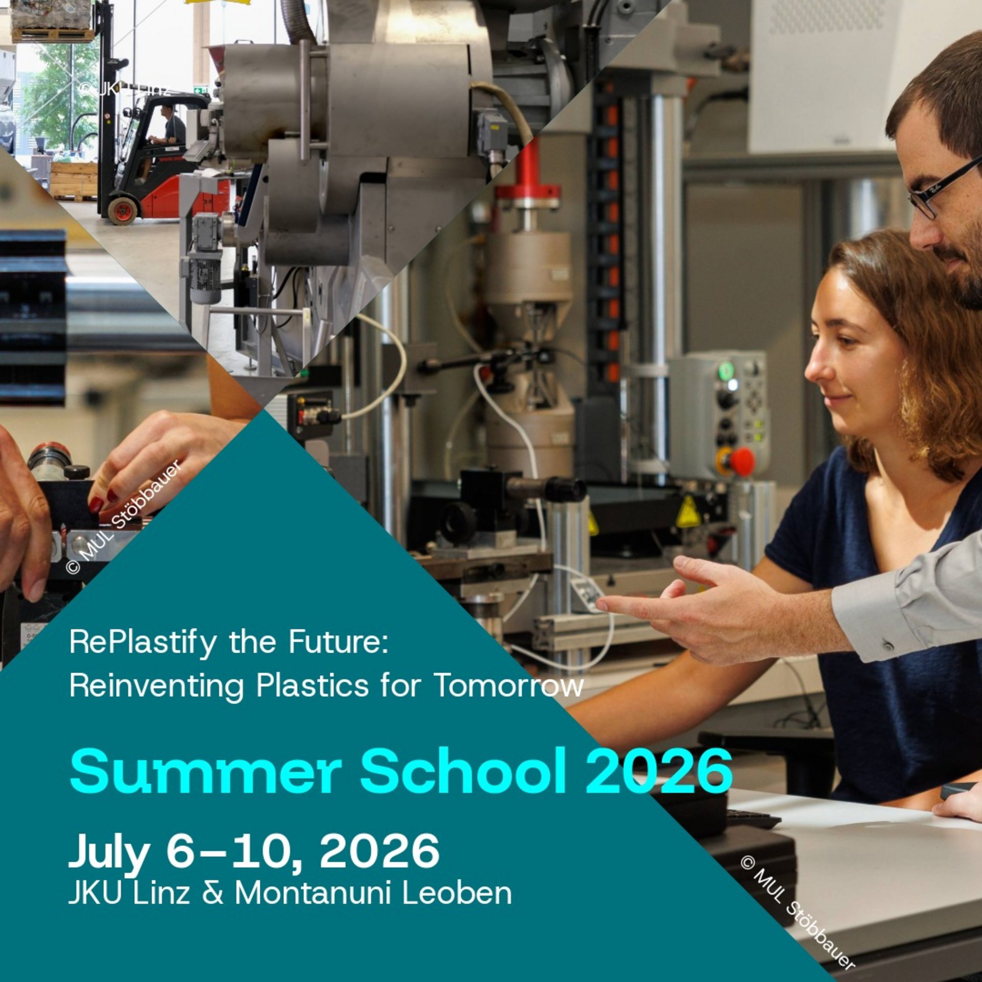 Die Summer School „RePlastify the Future“ findet vom 6.–10. Juli 2026 standortübergreifend an der Johannes Kepler Universität Linz (6.–8. Juli) und an der Montanuniversität Leoben (8.–10. Juli) statt. Im Fokus stehen Innovationen in der Kunststofftechnik, Circular Design sowie Reuse-/Recycling-Strategien. Master- und Doktoratsstudierende arbeiten in interdisziplinären Teams an praxisnahen Fragestellungen; das Programm umfasst Expert:innen-Inputs, Workshops und Networking-Sessions. Die Veranstaltungssprache ist Englisch.